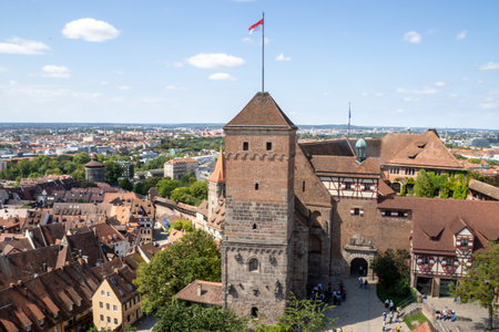 Panoramic view of Kaiserburg Nürnberg Castle from Sinwell Tower, Nuremberg, Germany, showcasing medieval architecture, royal palace, and historic gardens.