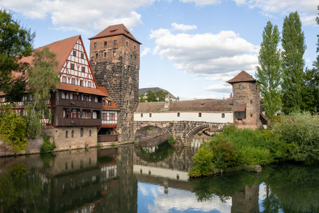 Scenic view of Nuremberg's Henkersteg Bridge with Henkerhaus Museum and Wasserturm in Bavaria, Germany, capturing historic timber architecture reflected over the Pegnitz River.