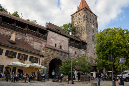 Nuremberg, Germany - July 30, 2023: View of Albrecht Durers House in Tirgertnertor square. Old town architecture with facade of medieval buildings, Nuremberg, Bavaria, Germany.