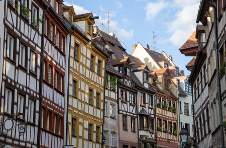 Colorful traditional timber-frame houses along Weißgerbergasse street in Nuremberg, Bavaria, Germany, showcasing charming medieval architecture in a picturesque old-town setting.