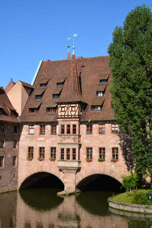 Nuremberg city in Germany (region of Middle Franconia). Pegnitz River bridge view with Henkerhaus and Weinstadel.