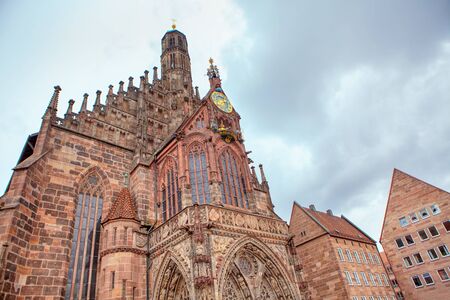 NURENBERG, GERMANY - JUNE 22, 2016: Exterior view of the Frauenkirche and historical building around in the old town part of Nurnberg on June 22, 2016. Its on the eastern side of the main market