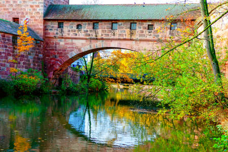 Arch bridge over the river . Autumn in Germany . Pegnitz river and arched bridge in Nuremberg