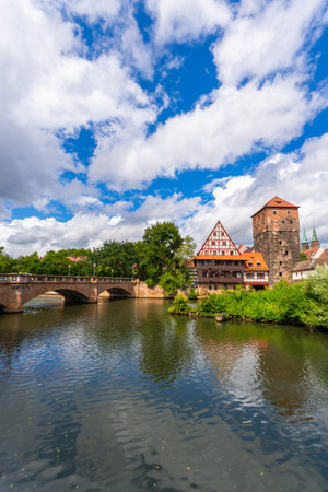 Scenic view of Henkerhaus Museum, Wasserturm, and both medieval bridges Henkersteg and the second wooden bridge in Nuremberg, Bavaria, overlooking the Pegnitz River.