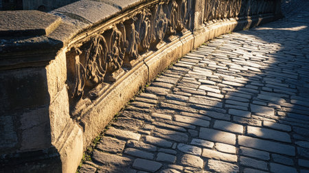 A close-up of a stone bridge with intricate carvings, its shadow stretching across the cobblestone path below, highlighting the textures of the ancient stone.