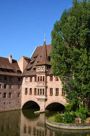 Nuremberg city in Germany (region of Middle Franconia). Pegnitz River bridge view with Henkerhaus and Weinstadel.