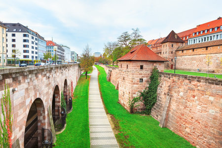 Historic city walls of Nuremberg, Germany, medieval fortifications, walkway, and lush greenery. Contrast between old architecture and modern buildings highlights city's blend of history and urban life