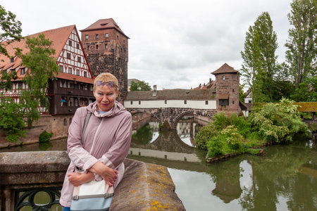 Attractive mature woman smiling on a bridge in Nuremberg. Travel in Bavaria