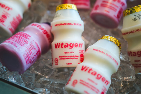 KUALA LUMPUR, MALAYSIA - JUNE 22, 2023: Vitagen bottles in a cold ice tray. Vitagen is a probiotic beverage cultured milk and good for a healthy digestive system.