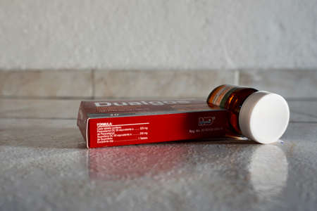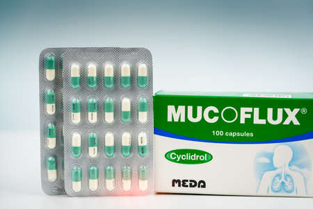 CHONBURI, THAILAND-AUGUST 3, 2018 : Mucoflux 100 mg. Cyclidrol product of MEDA Pharma (Thailand). Manufactured by Fulton Medicinali, Italy. Green-white capsules in blister pack near drug box package.