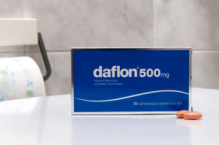 Carrara, Italy - April 11, 2020 - Box of Daflon coated tablets, a medicine used to treat hemorrhoids and symptoms attributable to venous insufficiency, states of capillary fragility.