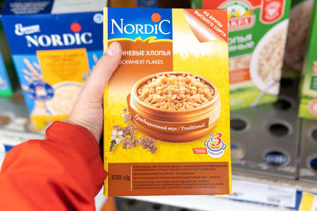 Tyumen, Russia-November 07, 2020: Elovena the firm Nordic. Gluten-free oatmeal