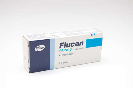 Packaging with tablets Flucan, Flukonazol, Pfizer. Antalya, Turkey - 05.20.2022.