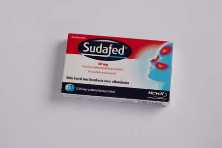 Tallinn, Estonia - 02.08.2022: Sudafed tablets by McNeil Healthcare. Pseudoephedrine nasal decongestant relieves sinus pressure and congestion.