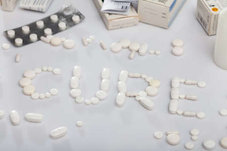 White pills, colored capsules and an ampoule of medicine on a light blue pastel table. Medical banner design template.