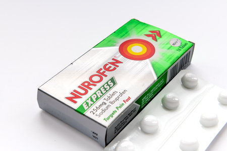 London. UK- 01.29.2023. A packet of Nurofen Express sodium ibuprofen tablets isolated in white. Medicine for pain relief, fever and cold.
