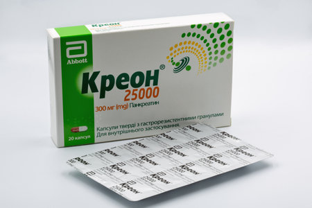 Kyiv, Ukraine - October 24, 2023: Creon pancreatin 25000 drug by Abbott for pancreatic exocrine insufficiency which may be caused by chronic pancreatitis, cystic fibrosis, partial pancreatectomy.