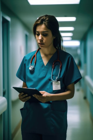 woman, doctor and tablet for news research or information on email or social media in hospital, created with generative ai