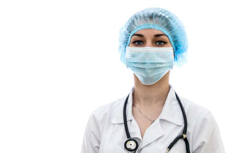 Confident female doctor or nurse wearing a face protective mask. Safety measures against the coronavirus. Prevention Covid-19 healthcare concept. Stethoscope over the neck. Woman, girl.