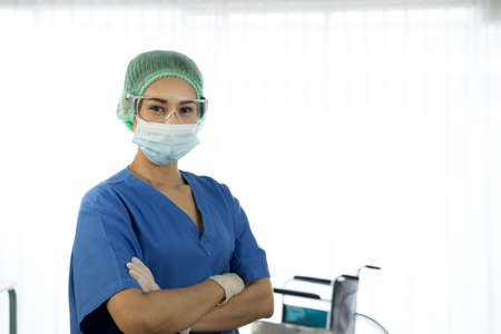 Asian female doctor or Nurse Wearing medical Protective Mask and glasses on face. Protection for Coronavirus COVID-19