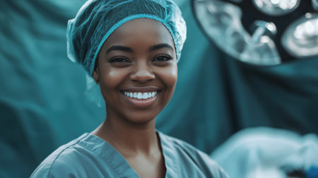 A smiling female surgeon in a well-lit operating room, preparing for surgery, wearing scrubs and gloves, exuding confidence.