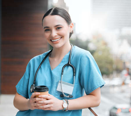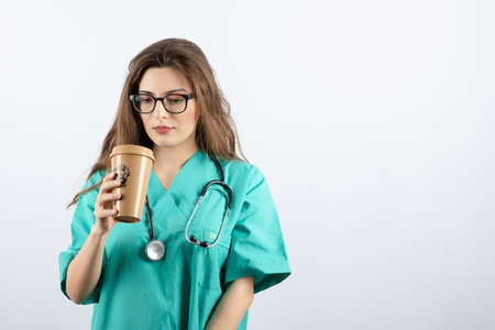 Young beautiful nurse with stethoscope holding a cup of coffee