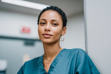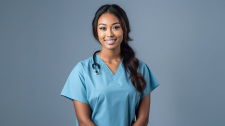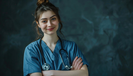A cheerful female nurse with curly hair stands confidently with her arms crossed, wearing scrubs and a stethoscope. Her warm smile radiates professionalism and compassion, embodying the dedication of healthcare workers.
