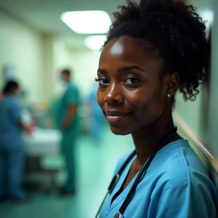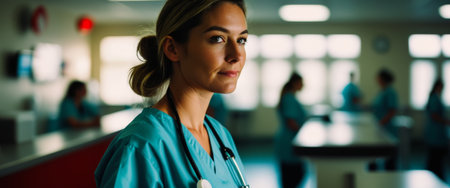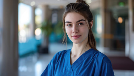 A nurse stands in a hospital corridor while wearing scrubs and looking at the camera. It is a busy day in the medical facility. The nurse appears confident and ready to help.