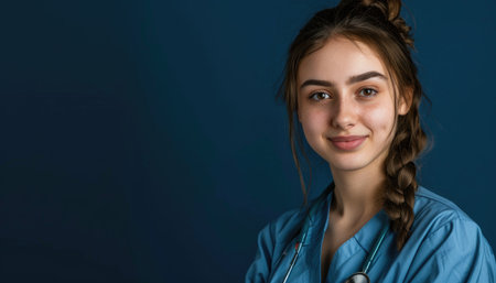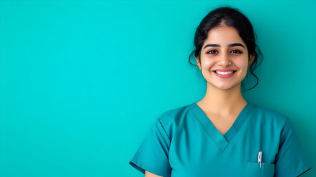 Young, smiling healthcare worker in scrubs poses against cyan.