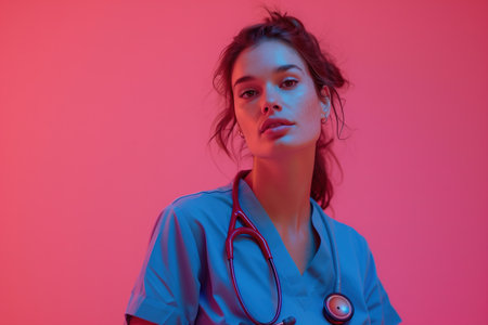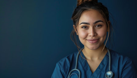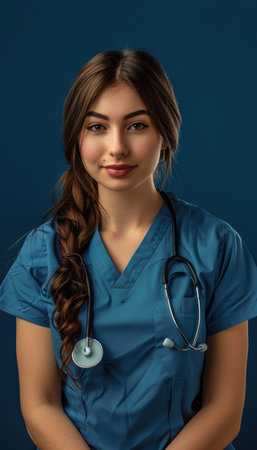 Mesmerizing portrait of a skilled and compassionate veterinary technician wearing a purple uniform, with a stethoscope draped over her neck and a caring expression on her face