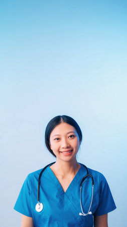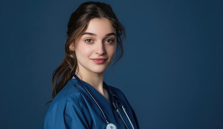 Portrait of a beautiful young female doctor with stethoscope on blue background