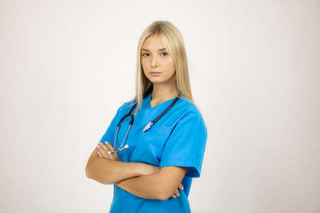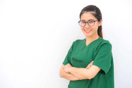 Portrait of young confident woman wearing surgical gown with isolated white wall background. Healthcare worker and Medical concept.