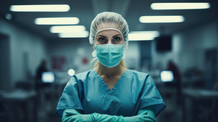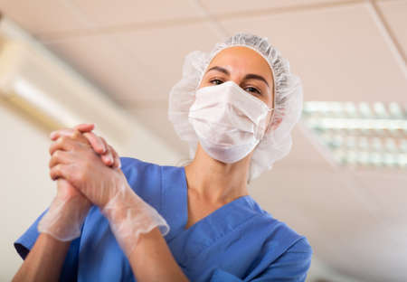 Female surgeon in mask standing in operating room with crossing hands, ready to work on patient