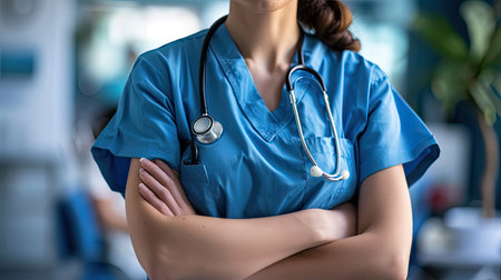 Midsection of female doctor wearing scrubs with stethoscope and arms crossed in hospital corridor. medical professional at work.
