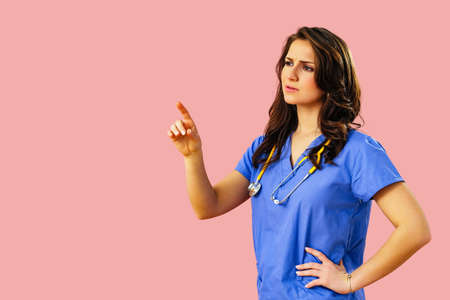 Portrait of serious female doctor or nurse in blue uniform pointing with finger at copy space