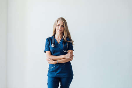 Caucasian Female Nurse in Blue Scrubs with Stethoscope