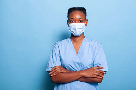 Portrait of african american practitioner nurse wearing protective medical face mask against virus working at sickness treatment in studio with blue background. Health care service