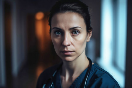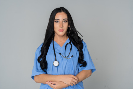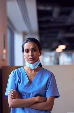 Portrait Of Serious Female Nurse Or Doctor Wearing Scrubs