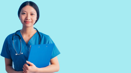 Female doctor. Healthcare worker. Smiling nurse. Confident happy medical staff woman in uniform with clipboard isolated on blue empty space background.