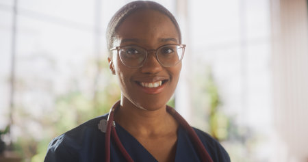 Portrait of a Black Female Medical Health Care Professional Posing for Camera, Smiling and Looking at Camera. African Clinic Physician Wearing Glasses, Working in