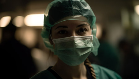 closeup shot of a young female doctor wearing a mask while standing in an office, created with generative ai