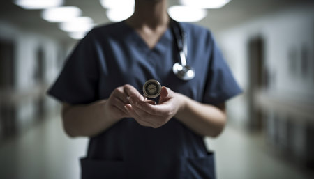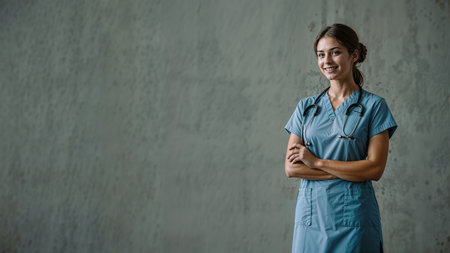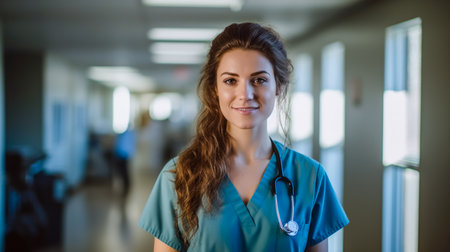 A young woman wearing scrubs stands confidently in a hospital hallway. She has a stethoscope around her neck and is ready for a busy day of caring for patients.