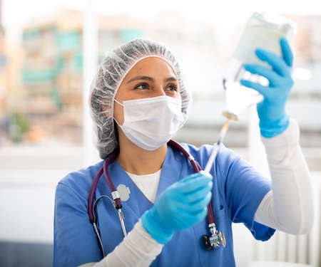 Female nurse wearing a protective mask fills a syringe with saline solution in the treatment room