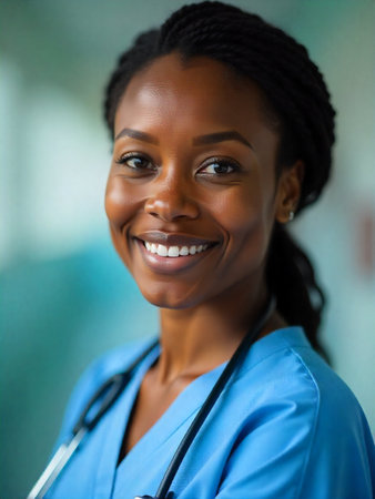 Portrait of a smiling african american nurse with stethoscope, hospital in background