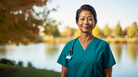 Hospice nurse in natural setting beside lake tranquility in care highlighted