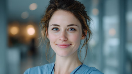 Confident young female healthcare professional smiling in a hospital hallway, demonstrating expertise and compassion in patient care