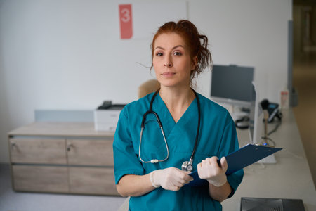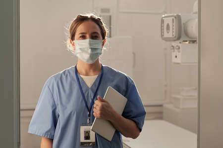 Pretty female healthcare worker in blue uniform and protective mask standing in medical office with x-ray equipment on background