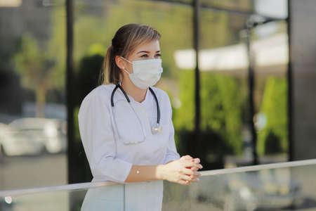 Portrait of very tired & exhausted female UK NHS doctor in front of hospital,blurry out of focus background, Coronavirus COVID-19 pandemic outbreak crisis,overworked medical staff working long shifts