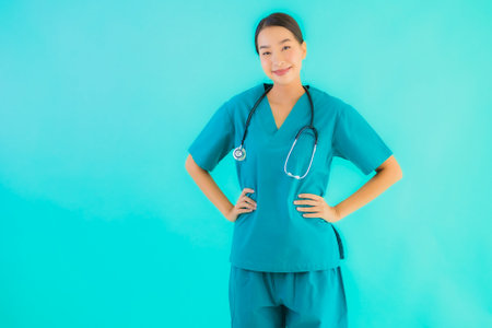 Portrait beautiful young asian doctor woman happy smile for work in hospital and clinic on blue isolated background