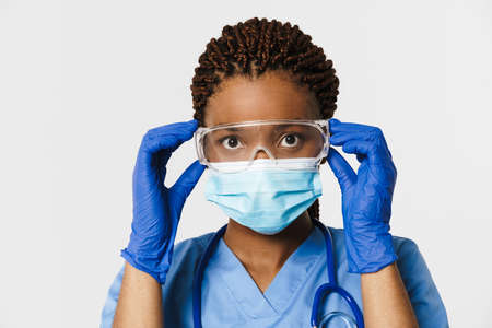 Black doctor wearing face mask posing in safety glasses isolated over white background
